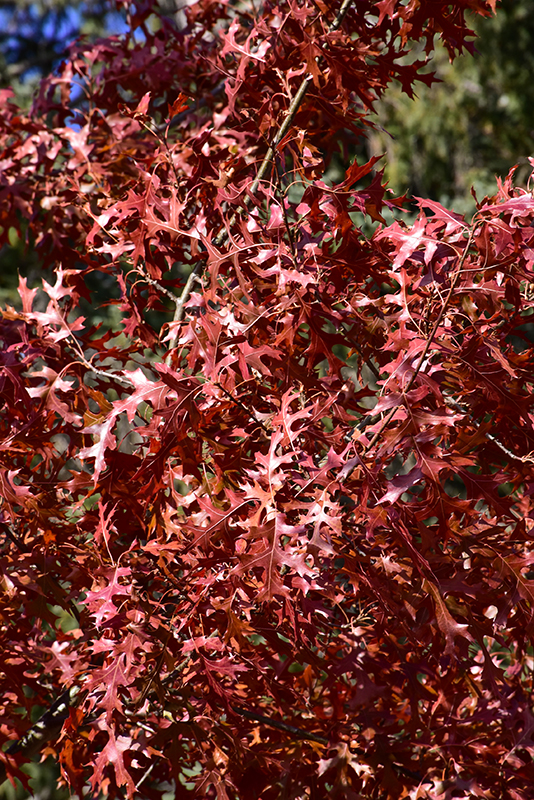 First Editions® Majestic Skies™ Northern Pin Oak has dark green deciduous foliage which emerges brick red in spring on a tree with an oval habit of growth. The glossy lobed leaves turn an outstanding red in the fall. However, the fruit can be messy in the landscape and may require occasional clean-up. The furrowed gray bark and silver branches add an interesting dimension to the landscape.