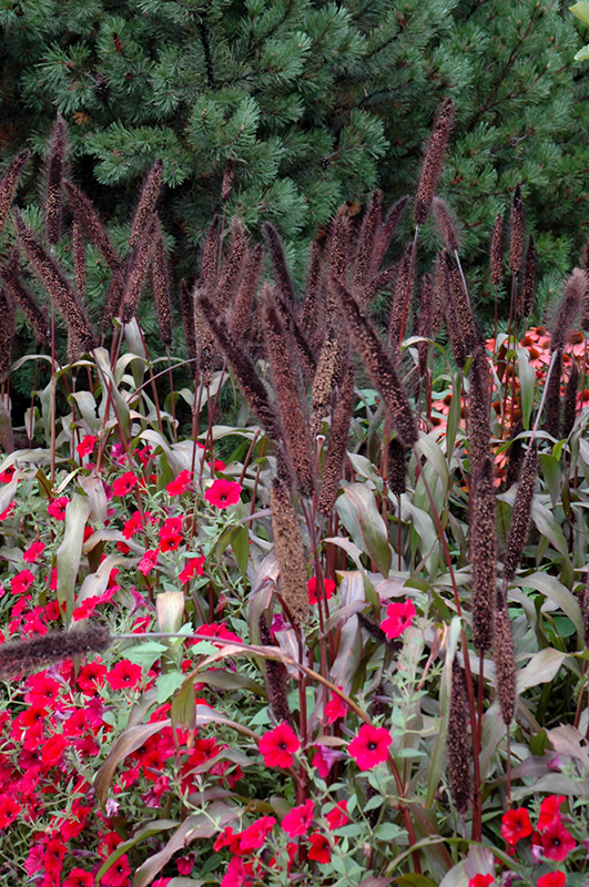 A warm season annual grass selected for its boldy coarse foliage which starts out green turning dark purple-burgundy over the summer and showy burgundy seed heads that persist into winter for a dramatic effect; use as a garden accent