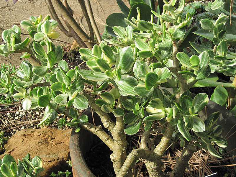 Variegated Jade Plant features showy clusters of white star-shaped flowers with pink overtones at the ends of the branches from late winter to early spring. The flowers are excellent for cutting. It has attractive green foliage with white stripes and tinges of buttery yellow. The succulent round leaves are highly ornamental and remain green throughout the winter. The smooth khaki (brownish-green) bark is extremely showy and adds significant winter interest.