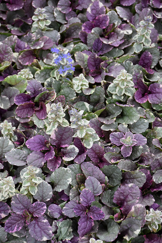 Burgundy Glow Ajuga's attractive small crinkled round leaves emerge burgundy in spring, turning dark green in color with showy creamy white variegation and tinges of purple the rest of the year on a plant with a spreading habit of growth. It features subtle spikes of sky blue flowers rising above the foliage from mid to late spring.