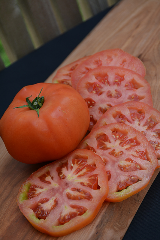 An amazing variety that produces beautiful, meaty, scarlet red tomatoes, weighing almost 2 pounds each; large size ideal for slicing; perfect for sandwiches, salads, grilled, canning and sauces; disease resistant; staking or caging is required