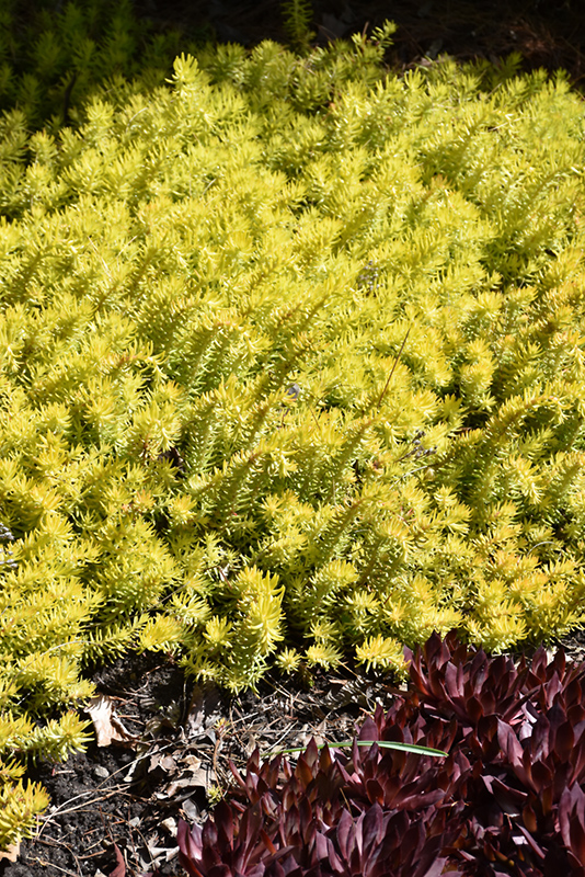 Angelina Sedum will grow to be only 5 inches tall at maturity extending to 8 inches tall with the flowers, with a spread of 15 inches. When grown in masses or used as a bedding plant, individual plants should be spaced approximately 10 inches apart. Its foliage tends to remain low and dense right to the ground. It grows at a fast rate, and under ideal conditions can be expected to live for approximately 10 years. As an herbaceous perennial, this plant will usually die back to the crown each winter, and will regrow from the base each spring. Be careful not to disturb the crown in late winter when it may not be readily seen!