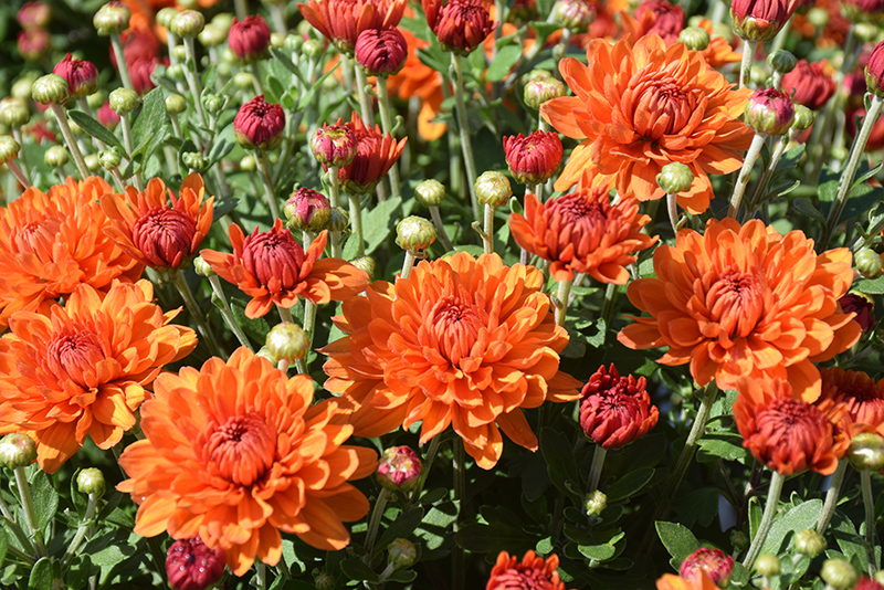 Autumn Spice Igloo Chrysanthemum is covered in stunning double orange daisy flowers with coppery-bronze overtones at the ends of the stems from late summer to late fall. The flowers are excellent for cutting. Its fragrant ferny leaves remain dark green in color throughout the season.