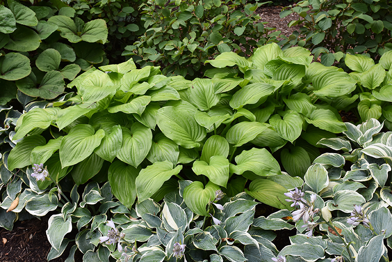 Guacamole Hosta will grow to be about 22 inches tall at maturity extending to 3 feet tall with the flowers, with a spread of 3 feet. When grown in masses or used as a bedding plant, individual plants should be spaced approximately 3 feet apart. Its foliage tends to remain dense right to the ground, not requiring facer plants in front. It grows at a medium rate, and under ideal conditions can be expected to live for approximately 10 years. As an herbaceous perennial, this plant will usually die back to the crown each winter, and will regrow from the base each spring. Be careful not to disturb the crown in late winter when it may not be readily seen!
